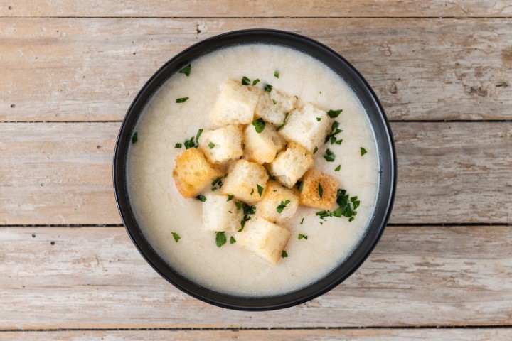 Cauliflower soup in a bowl on wooden table